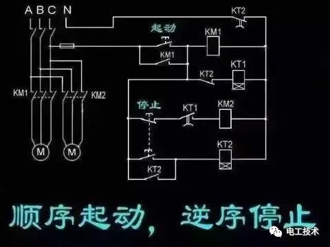 启动按钮按下后km1吸合并保持,KTI1延时后KM2工作;停止按钮按下后,km2先断电停运,经KT22延时后km1断电停运。