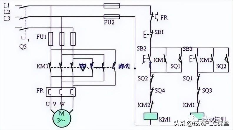 合上电源开关QS,按下起动按钮SB2,KM1线圈得电,KM1联锁触点和自锁触点分别断开和闭合,起到联锁和自锁保护作用,KM1主触点闭合,电动机正转,拖动工作台右移。